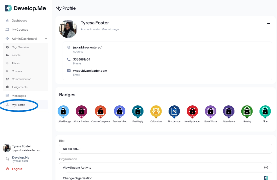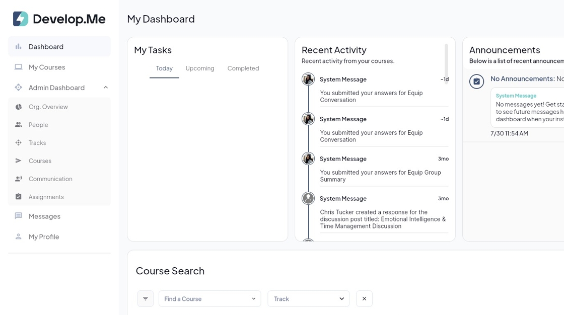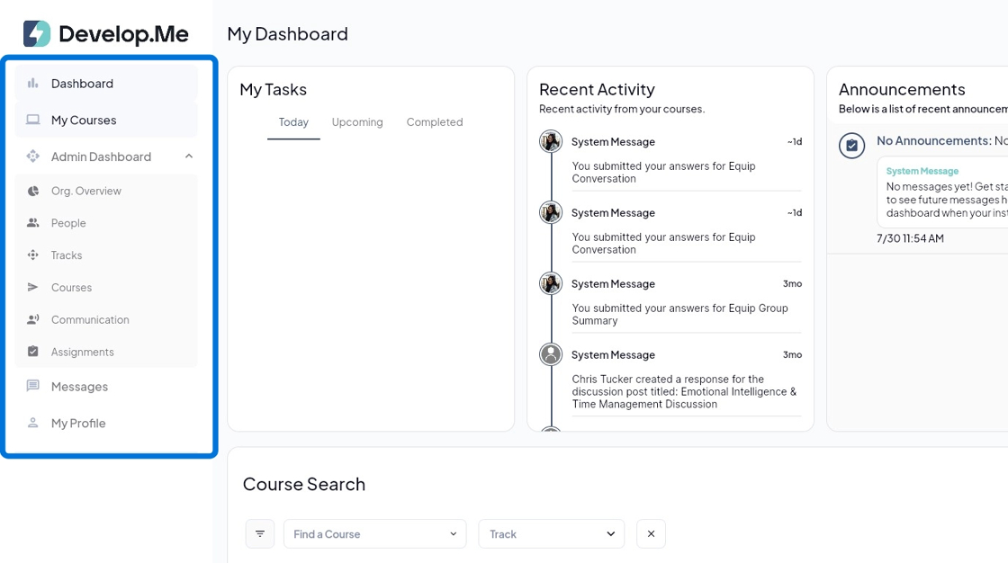 - Courses: View and manage all courses within your organization, including adding new courses and updating existing ones.