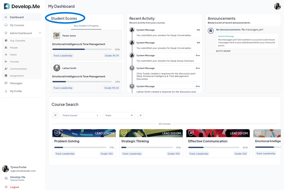 2. Student Scores-this section displays each student’s progress and performance in their enrolled courses. Use this area to quickly monitor learner engagement and identify those who may need additional support or follow-up.