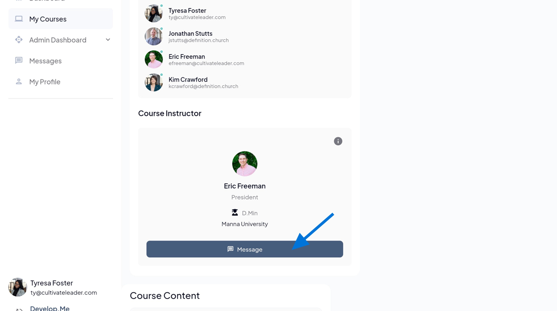 2. Inside the course, locate the "Course Instructor" section and click "Message" to begin composing your message.