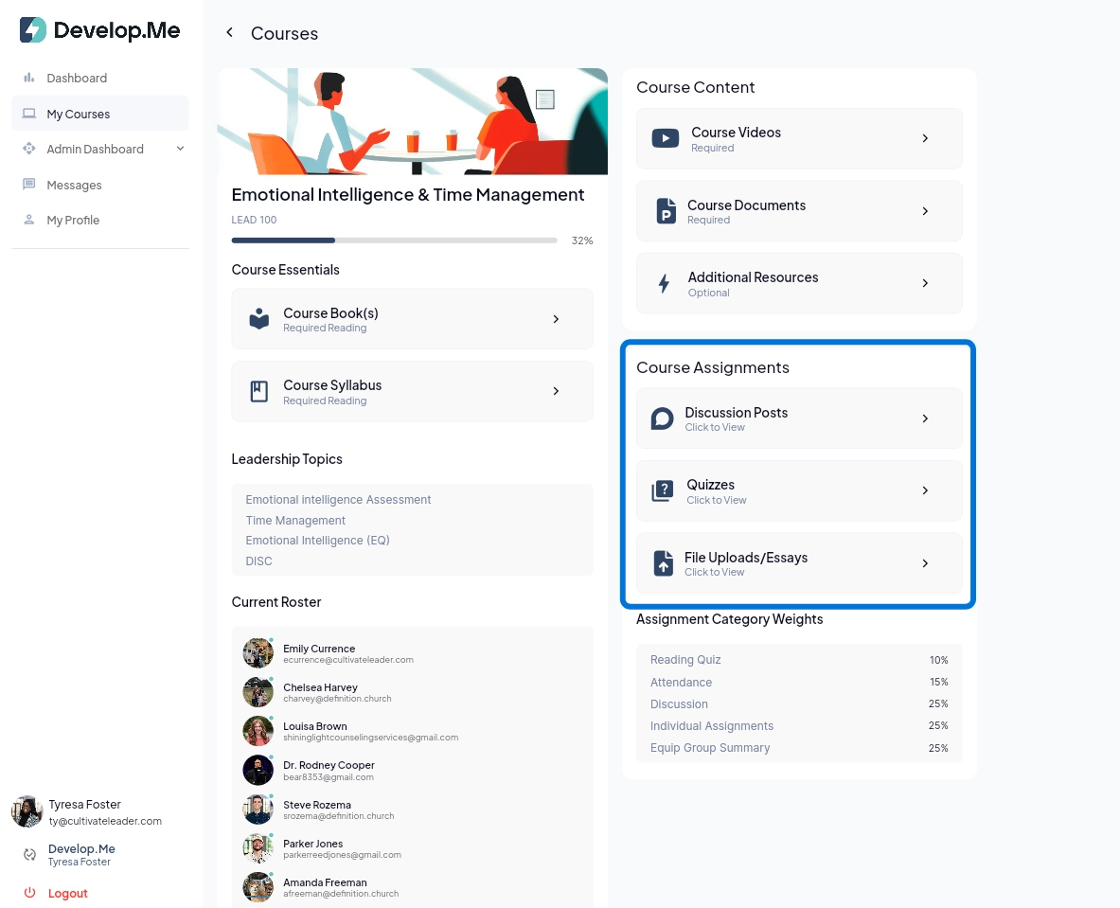 2. There are three types of assignments: Discussion Posts, Quizzes, and File Uploads/Essays. Make sure to review each section to see all required assignment details.