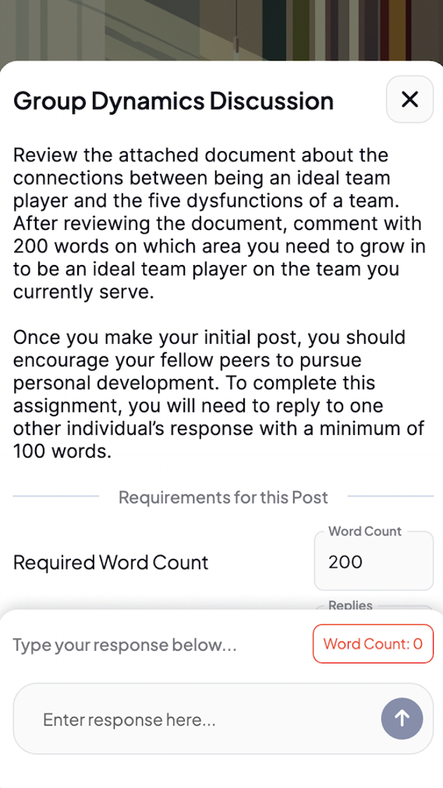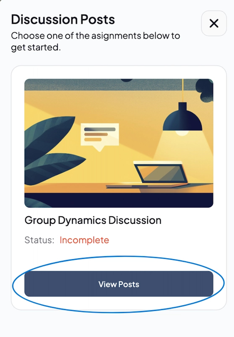 2. Next, select the “Assignments” tab. You’ll find three types of assignments: Discussion Posts, Quizzes, and File Uploads/Essays. Be sure to review each section to view all required assignment details.