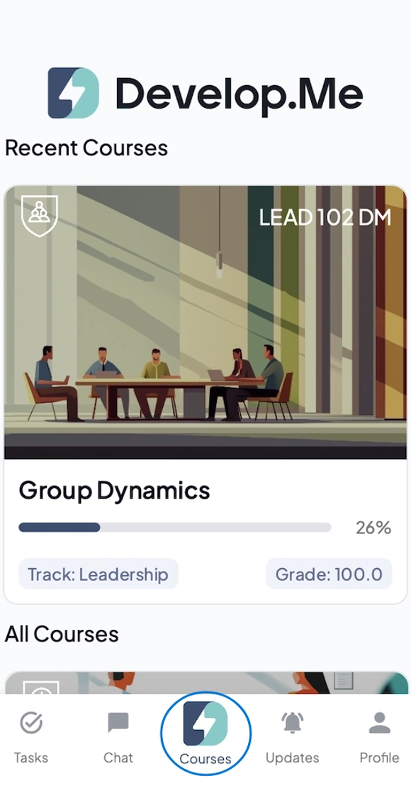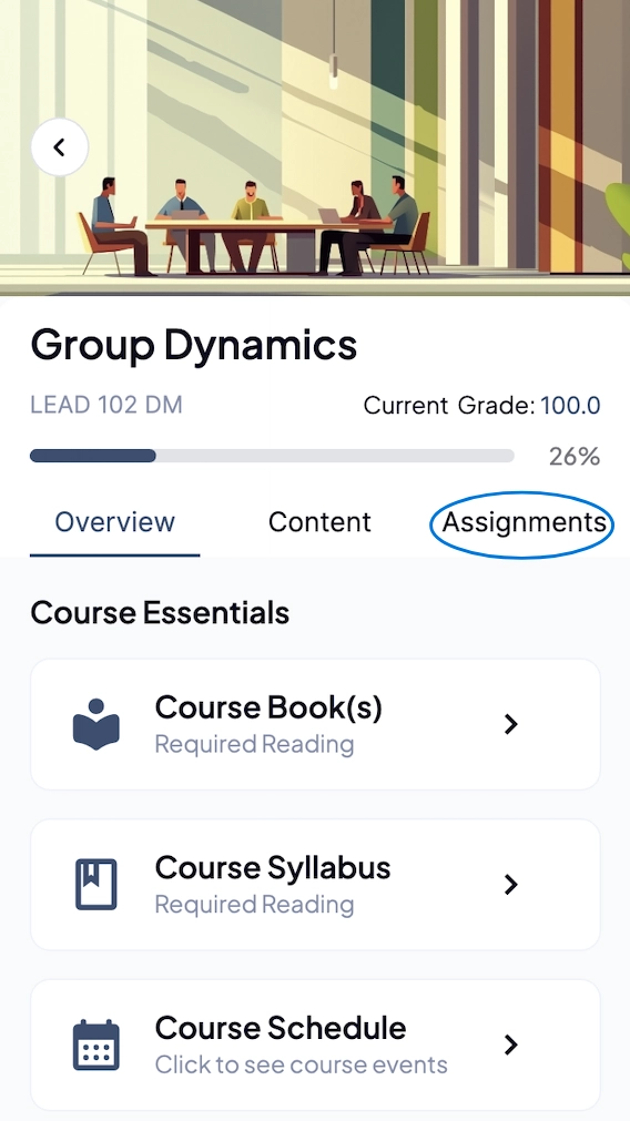 1. To view your course assignments, tap your course from the “Courses” tab located in the bottom menu bar.